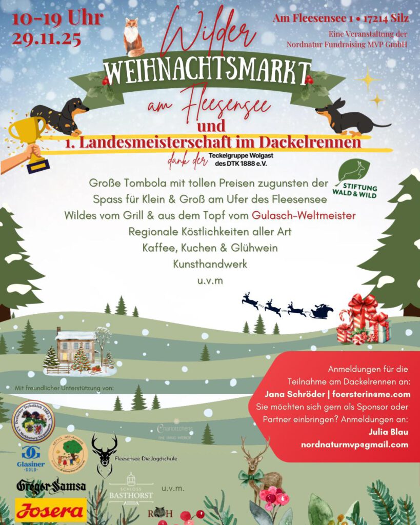 Kategorien Neuigkeiten Veranstaltungen „Wilder Weihnachtsmarkt am Fleesensee“/ 1. Landesmeisterschaft im Dackelrennen Beitragsautor Von Teckelgruppe Wolgast Veröffentlichungsdatum 14. Oktober 2025 am 29.11.2025 in Am Fleesensee 1, 17214 Silz ← TÜT-Schießen